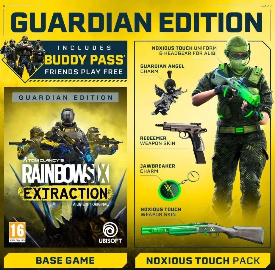 В издание Guardian Edition входят: копия игры Rainbow Six Эвакуация, пропуск Buddy Pass и набор "Ядовитый штрих", включающий в себя форму и элемент "Ядовитый штрих" (только для Alibi), универсальные раскраски оружия "Ядовитый штрих" и "Избавление", а также значки "Челюсти" и "Ангел-хранитель".